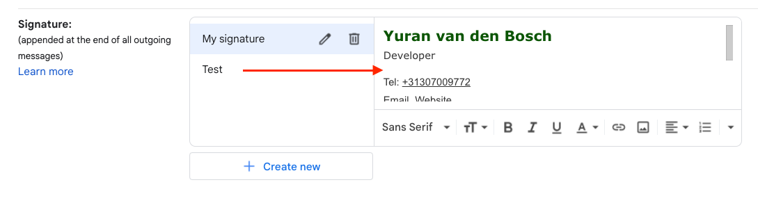 Scroll down to the signature section. Create a new signature if needed, and paste the previously copied signature in the text field.